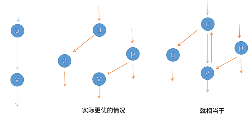 上有多条增广路,其中,我们选择进行一次先后经过 的增广(如左图所示),流量增加 。我们注意到,如果进行中图上的增广,这个局部的最大流量不是 而是 。但由于指向 的边和从 出发的边在第一次增广中耗尽了容量,此时我们无法进行中图上的增广。这意味着我们当前的流是不够优的,但局部可能已经没有其他(只经过原图中的边而不经过反向边的)增广路了。 现在引入退流操作。第一次增广后,退流意味着 增加了 剩余容量,即相当于新增 这条边,因此我们可以再进行一次先后经过 的增广(如右图橙色路径所示)。无向边 上的流量在两次增广中抵消,我们惊奇地发现两次增广叠加得到的结果实际上和中图是等价的。