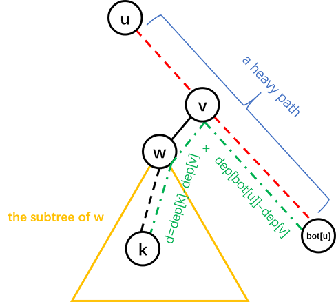 根据长链剖分的性质, , 也就是说,我们可以 在这条重链的表格上求出的这个节点的 级祖先。