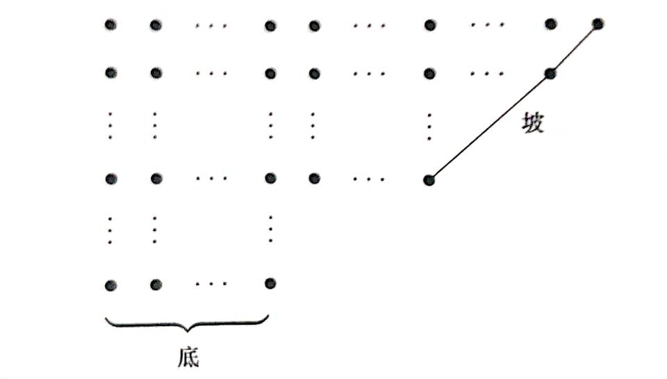 画出每个互异分拆的 Ferrers 图。最后一行称为这个图的底,底上点的个数记为