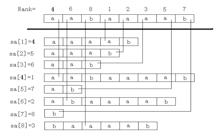 其中, 表示将所有后缀排序后第 小的后缀的编号,也是所说的后缀数组,后文也称编号数组 ;
