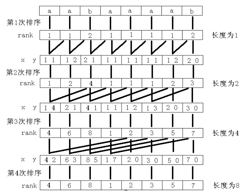 用两个长度为 的子串的排名,即 和 ,作为排序的第一第二关键字,就可以对字符串 的每个长度为 的子串: 进行排序,得到 和 ;