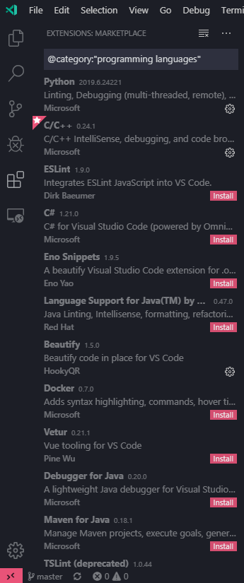 在 VS Code 中打开扩展商店,在搜索栏中输入 C++ 或者 @category:"programming languages",然后找到 C/C++,点击 Install 安装扩展。