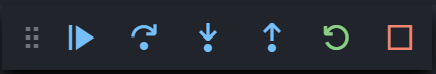 按下F5进入调试模式,编辑器上方会出现一个调试工具栏,四个蓝色按钮从左至右分别代表 GDB 中的 continue,next,step 和 until: